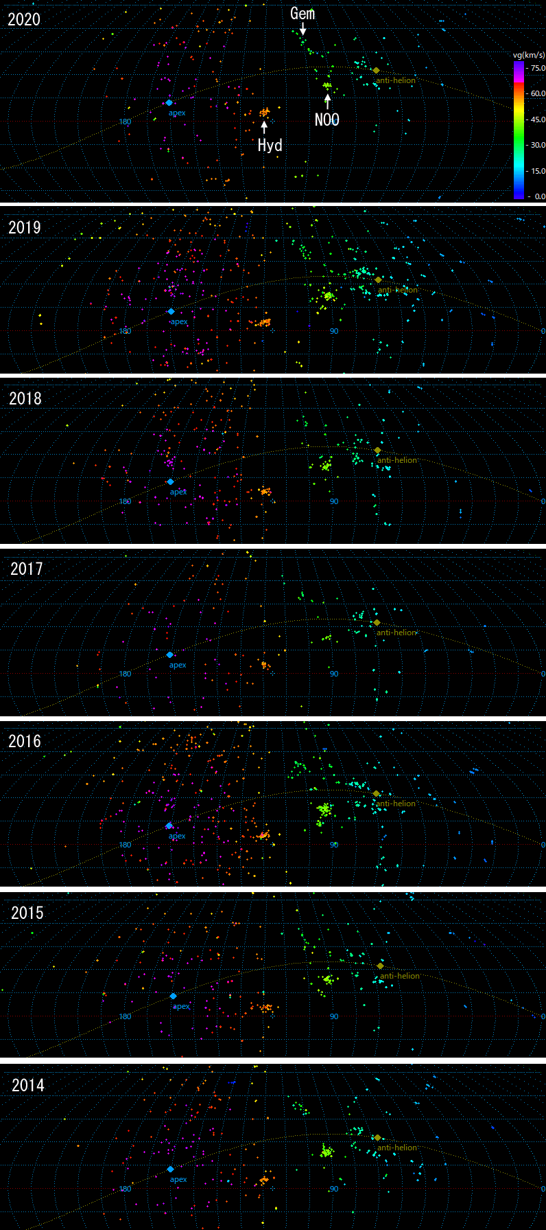 上田昌良さんは2014年のこの群の活動をまとめて、11月26日以前については放射点が拡散しているのでHYD群でないとしています。